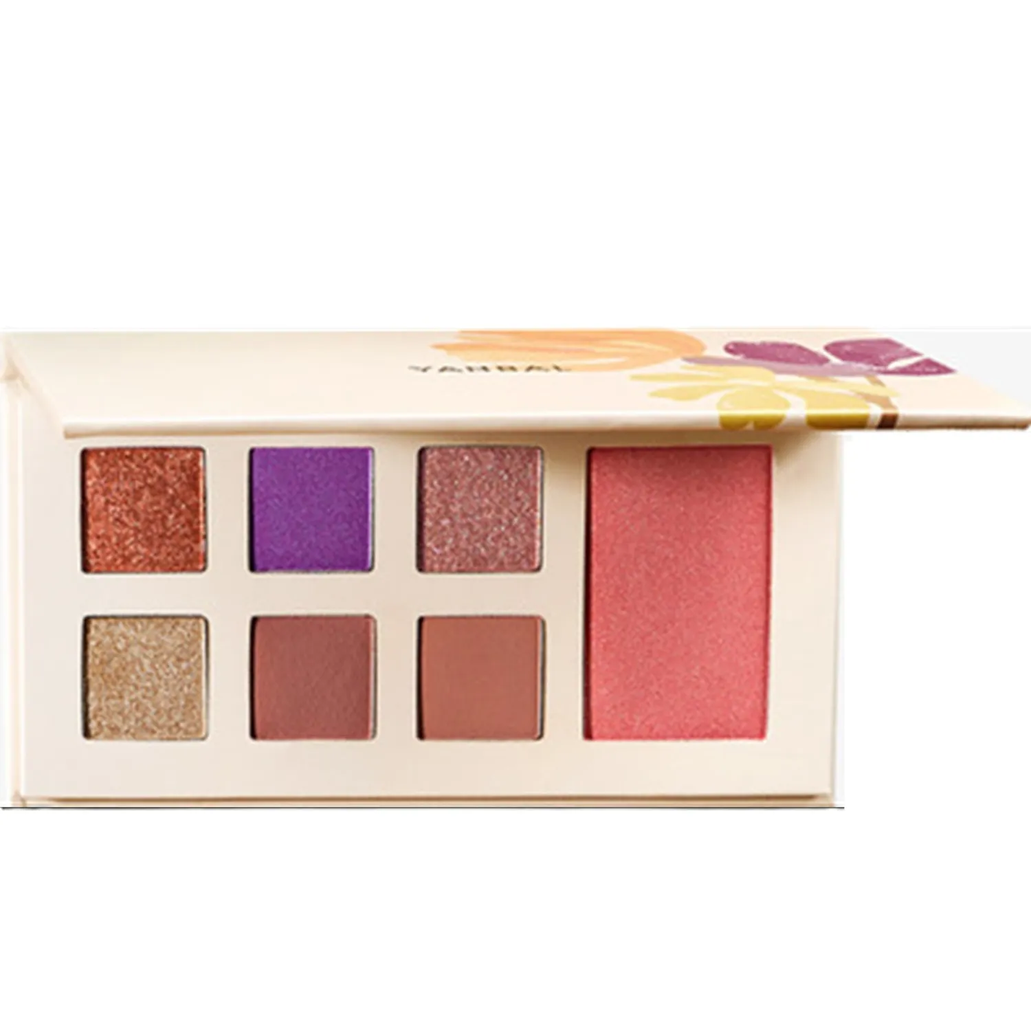 Paleta multifuncional AMOR QUE FLORECE de Yanbal. 6 tonos de sombras, rubor, iluminador y labial en un solo producto. ¡Maquillaje fácil y práctico!